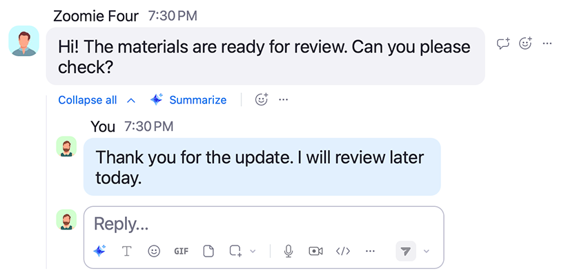 When you receive a notification for a Team Chat message, hover over the notification and click Reply . Enter your response in the text box. Click Reply or press the Enter key to send your message. Your message will be sent as a response to the thread.