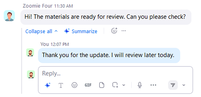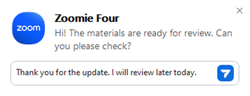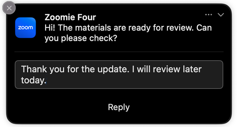Replying to messages and meeting reminders from device notifications If you have notifications from Zoom enabled, you can reply to Team Chat messages and Zoom meeting reminders directly from the notifications you receive on your device. For example, if you’re currently in a meeting that is running late, you can message participants in the upcoming meeting to let them know you’re running late. For ad-hoc meeting invites, you can decline and send a private message to the person inviting you. These features help minimize context switching and improve communication speed.