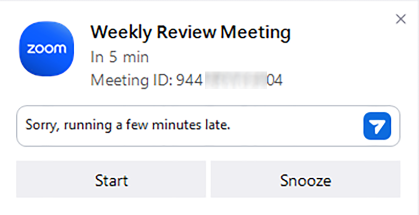 Zoom desktop app for Windows or macOS: 6.6.0 or higher Notifications are enabled on your device and in the Zoom Workplace app settingsTo respond to upcoming meeting notifications with a message: