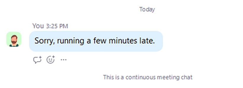 Custom message : Click this option to enter your own message, then click Message or press the Enter key to send it to the meeting chat.Message "I'm running late" : Click this option to automatically message "I'm running late" to the meeting chat.Message "Won't be able to join" : Click this option to automatically message "Won't be able to join" to the meeting chat. The message will be sent to the continuous meeting chat.