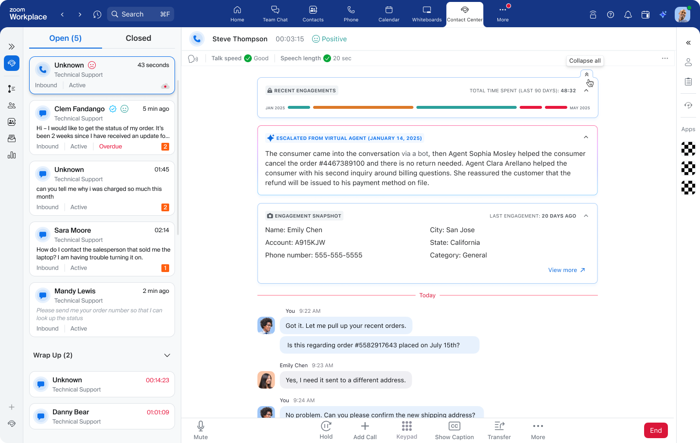 - Recent engagements card: This card displays the caller’s most recent interactions within the last 90 days at a glance, including engagement summaries and consumer sentiment indicators (green, yellow, or red). Clicking an engagement opens an AI-generated summary, and agents can toggle to a threaded transcript view to see the full conversation details.